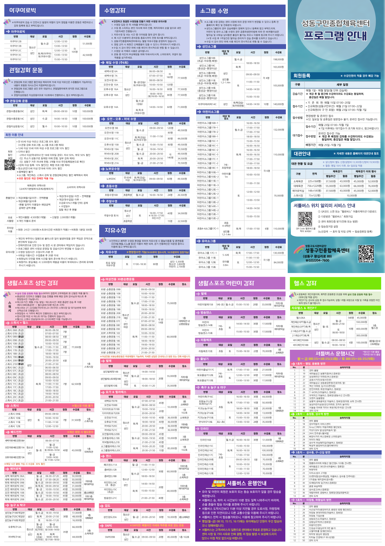 성동구민종합체육센터 [성동구민종합체육센터]수영 및 생활스포츠 프로그램 안내 작성자 관리자 등록일자 2024년 9월 5일 12시 47분 32초 조회 2,019 성동구민종합체육센터의 수영 및 생활스포츠 프로그램 안내 입니다. 자세한 내용은 02-2204-7600으로 문의 해 주시기 바랍니다. 성동구민종합체육센터(전단지.png [ Size : 1.75MB , Down : 1,744 ] 미리보기 다운로드 성동구민종합체육센터_전단지.pdf [ Size : 7.66MB , Down : 1,314 ] 다운로드 목록보기