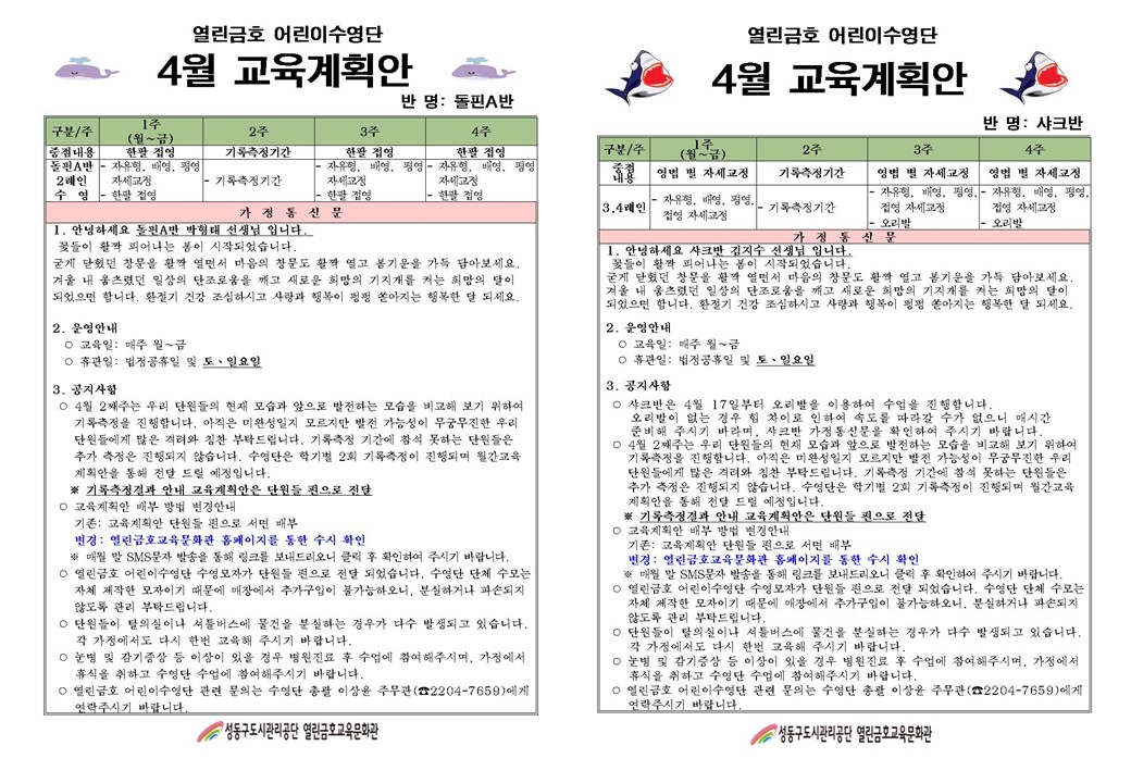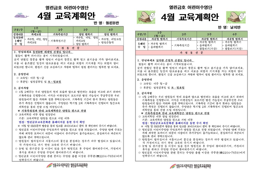 열린금호교육문화관 2023년 4월 어린이수영단 계획안 작성자 관리자 등록일자 2023년 3월 27일 14시 52분 20초 조회 476 2023년 4월 어린이수영단계획안.hwp [ Size : 279KB , Down : 499 ] 다운로드 01.JPG [ Size : 232.18KB , Down : 360 ] 미리보기 다운로드 02.JPG [ Size : 234.77KB , Down : 384 ] 미리보기 다운로드 목록보기