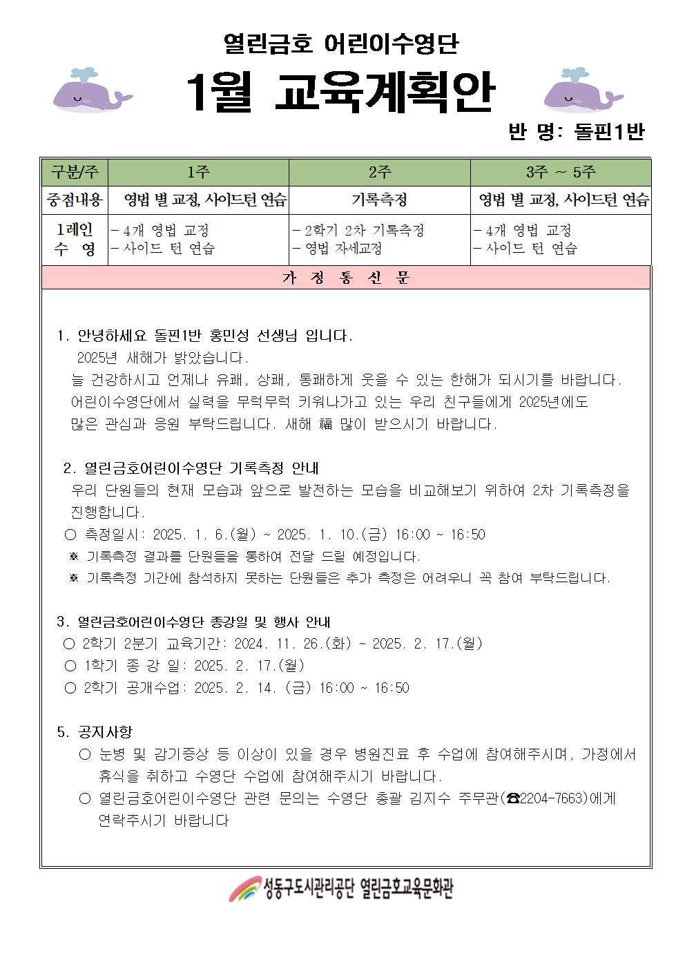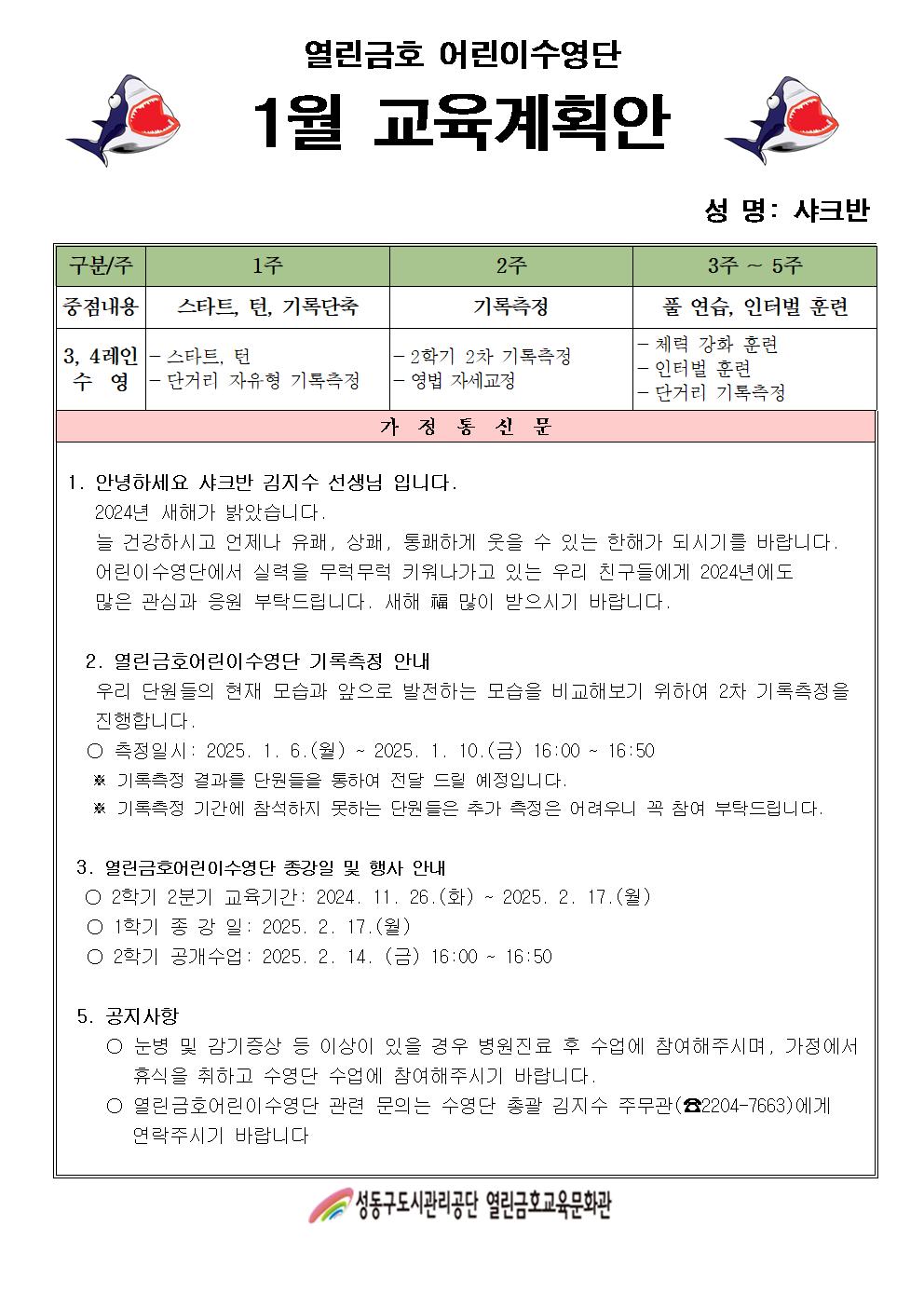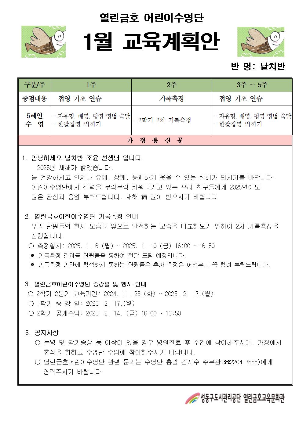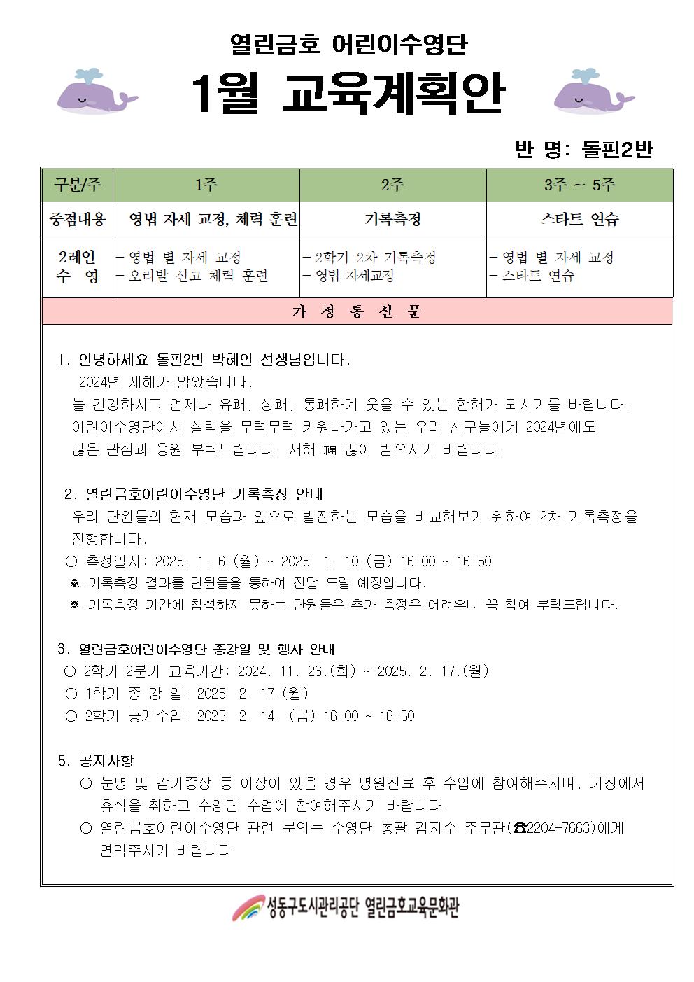 열린금호교육문화관 2025년 1월 어린이수영단 계획안(날치반, 돌핀1,2반, 샤크반) 작성자 관리자 등록일자 2024년 12월 31일 9시 48분 2초 조회 288 날치반.jpg [ Size : 190.28KB , Down : 262 ] 미리보기 다운로드 돌핀1반.jpg [ Size : 185.97KB , Down : 266 ] 미리보기 다운로드 돌핀2반.jpg [ Size : 180.88KB , Down : 259 ] 미리보기 다운로드 샤크반.jpg [ Size : 190.02KB , Down : 258 ] 미리보기 다운로드 목록보기