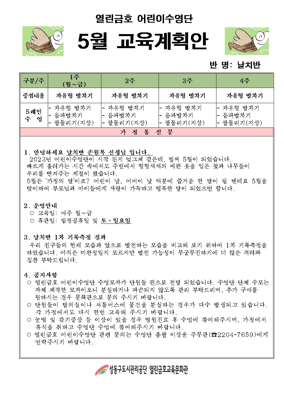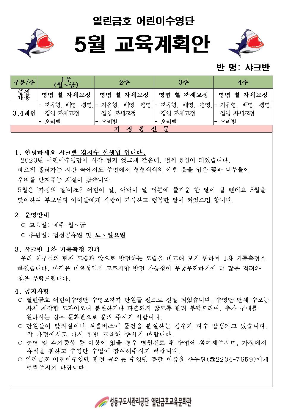 열린금호교육문화관 2023년 5월 어린이수영단 계획안(날치반,샤크반) 작성자 관리자 등록일자 2023년 4월 25일 16시 13분 15초 조회 319 어린이수영단 5월 교육계획안(날치반)001.jpg [ Size : 226.93KB , Down : 333 ] 미리보기 다운로드 어린이수영단 5월 교육계획안(샤크반)001.jpg [ Size : 221.61KB , Down : 356 ] 미리보기 다운로드 목록보기