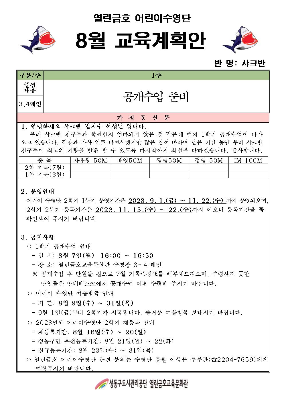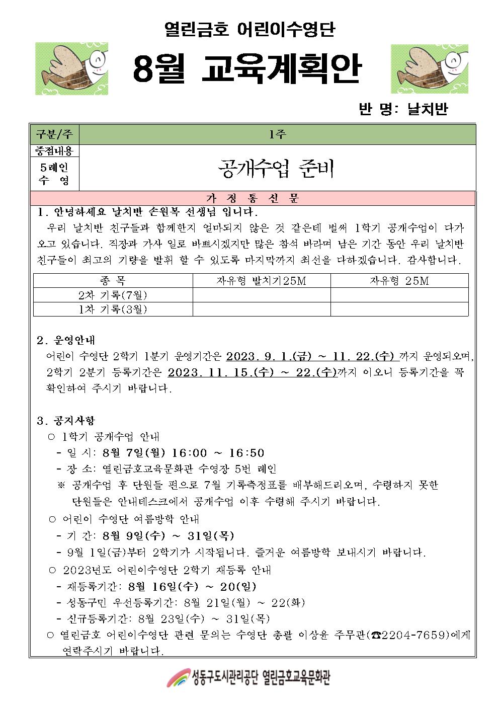 열린금호교육문화관 2023년 8월 어린이수영단 계획안(날치반,샤크반) 작성자 관리자 등록일자 2023년 7월 28일 16시 33분 48초 조회 407 2023년 8월 어린이수영단계획안001.jpg [ Size : 205.76KB , Down : 297 ] 미리보기 다운로드 2023년 8월 어린이수영단계획안004.jpg [ Size : 203.12KB , Down : 311 ] 미리보기 다운로드 목록보기