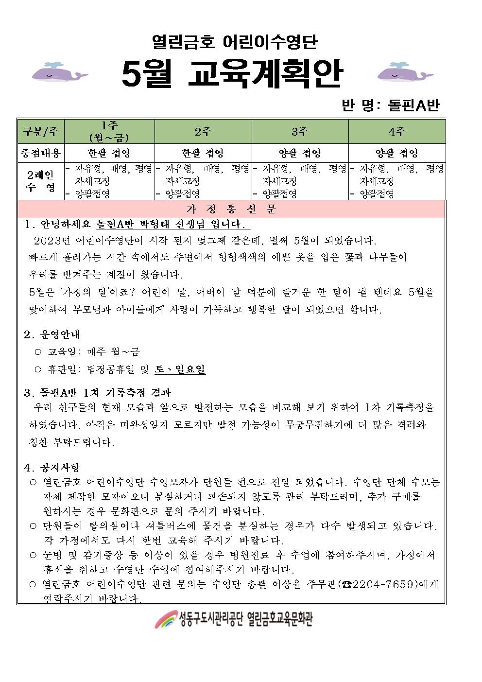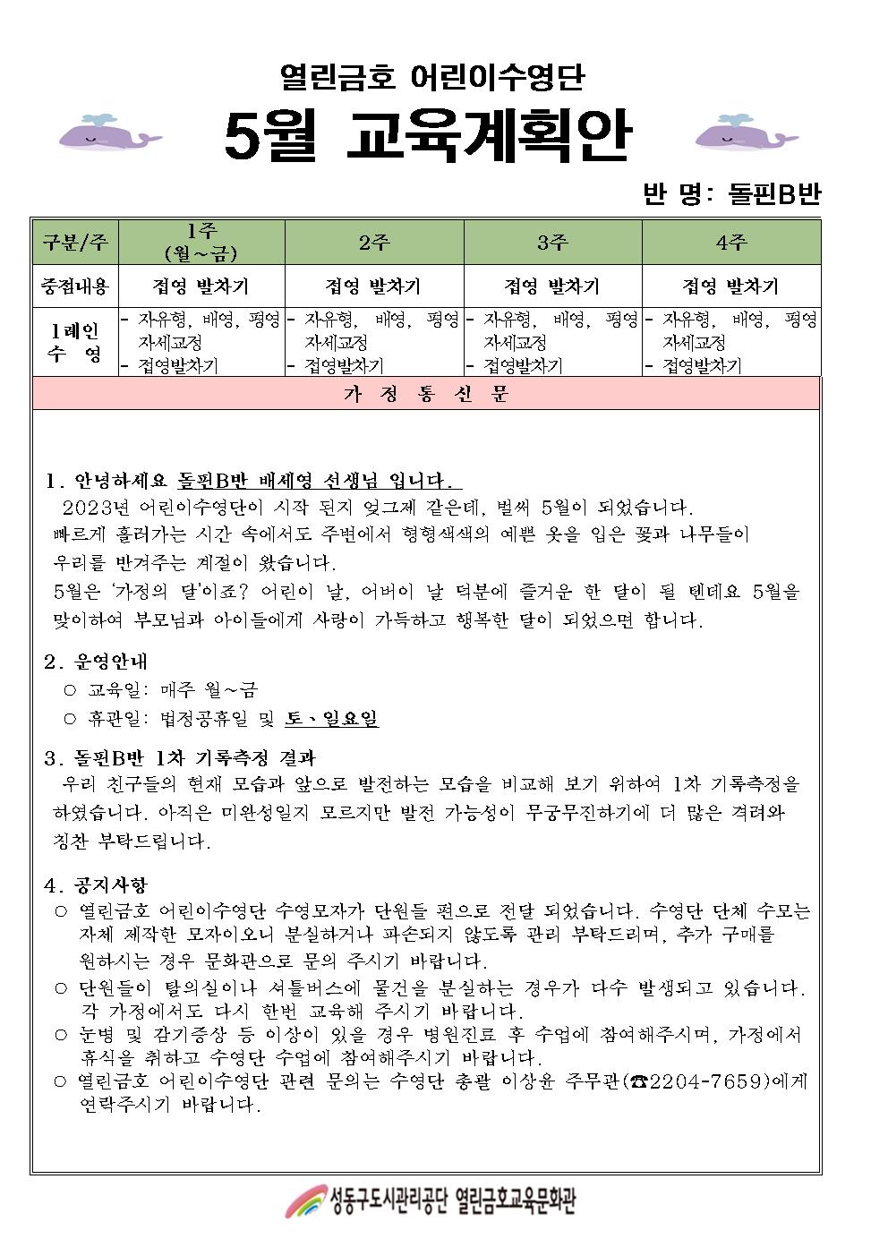 열린금호교육문화관 2023년 5월 어린이수영단 계획안(돌핀A,B반) 작성자 관리자 등록일자 2023년 4월 25일 16시 12분 47초 조회 333 어린이수영단 5월 교육계획안(돌핀A반)001.jpg [ Size : 212.02KB , Down : 367 ] 미리보기 다운로드 어린이수영단 5월 교육계획안(돌핀B반)001.jpg [ Size : 216.82KB , Down : 285 ] 미리보기 다운로드 목록보기