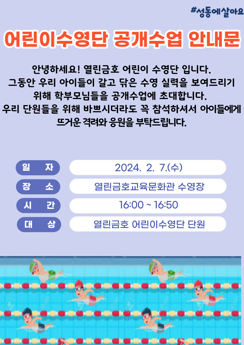 열린금호교육문화관 어린이수영단 공개수업 안내문 작성자 관리자 등록일자 2024년 1월 18일 14시 5분 31초 조회 460 어린이수영단 공개수업 안내문.jpg [ Size : 241.28KB , Down : 409 ] 미리보기 다운로드 목록보기