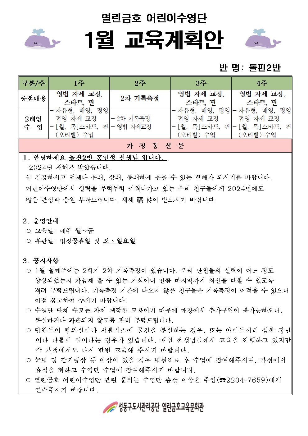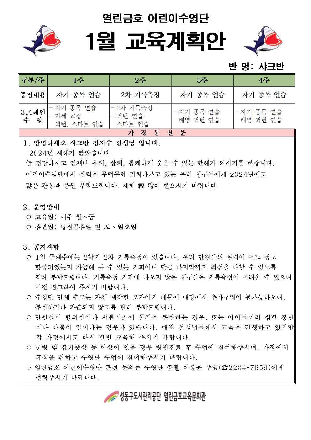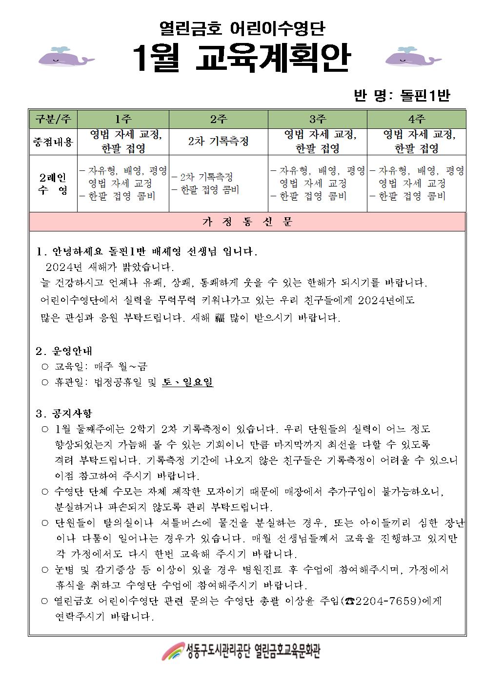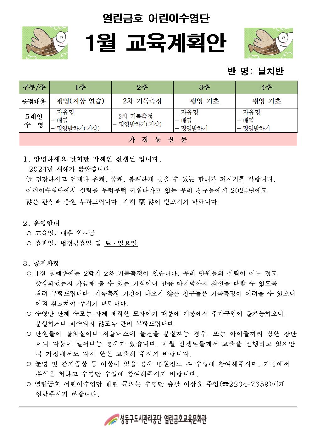 열린금호교육문화관 2024년 1월 어린이수영단 계획안(날치반, 돌핀1,2반, 샤크반) 작성자 관리자 등록일자 2023년 12월 22일 9시 36분 41초 조회 374 2024년 1월 어린이수영단계획안-1.jpg [ Size : 210.56KB , Down : 288 ] 미리보기 다운로드 2024년 1월 어린이수영단계획안-2.jpg [ Size : 211.03KB , Down : 268 ] 미리보기 다운로드 2024년 1월 어린이수영단계획안-3.jpg [ Size : 211.52KB , Down : 285 ] 미리보기 다운로드 2024년 1월 어린이수영단계획안-4.jpg [ Size : 213.09KB , Down : 326 ] 미리보기 다운로드 목록보기