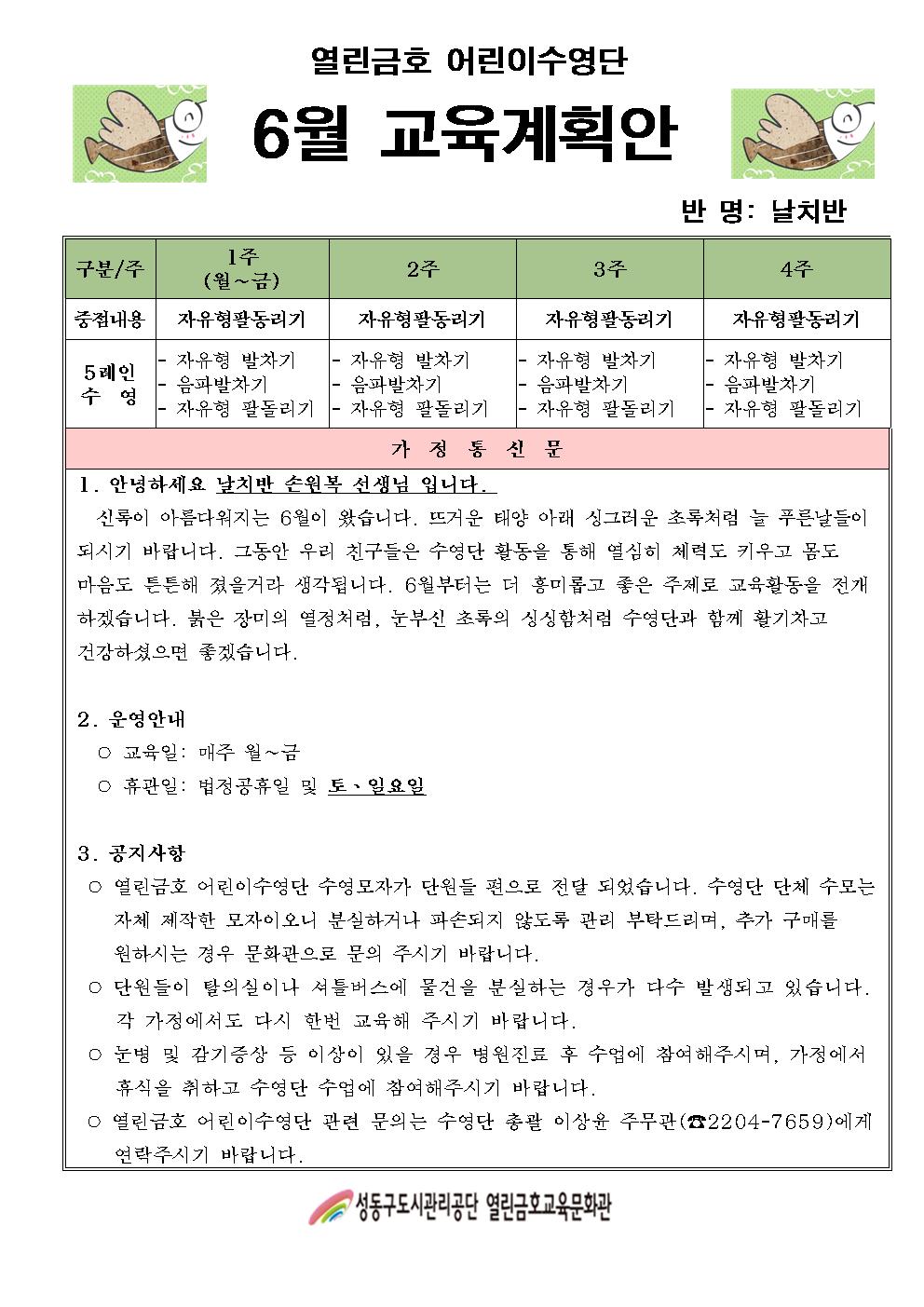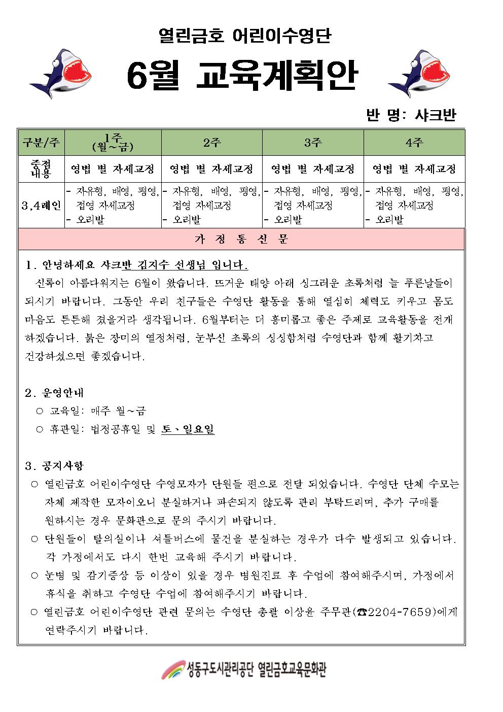 열린금호교육문화관 2023년 6월 어린이수영단 계획안(날치반,샤크반) 작성자 관리자 등록일자 2023년 5월 26일 15시 5분 29초 조회 274 어린이수영단 6월 교육계획안(날치반)001.jpg [ Size : 212.56KB , Down : 300 ] 미리보기 다운로드 어린이수영단 6월 교육계획안(샤크반)001.jpg [ Size : 200.66KB , Down : 326 ] 미리보기 다운로드 목록보기