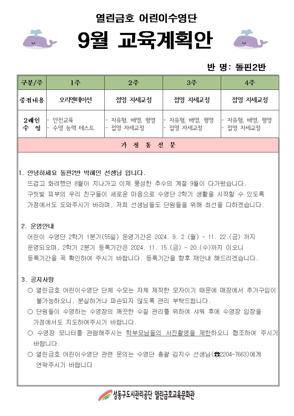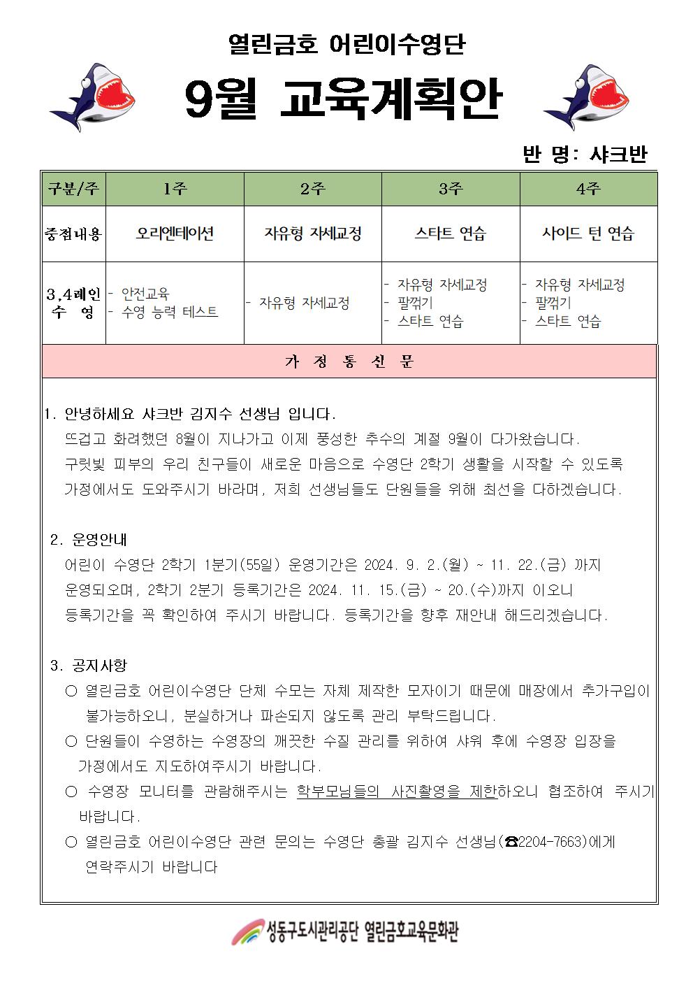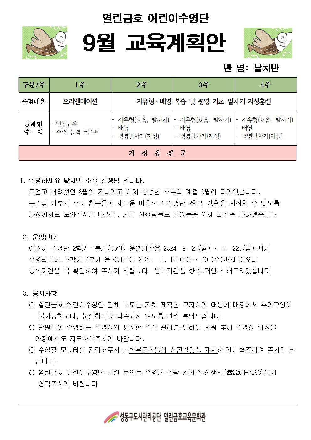 열린금호교육문화관 2024년 9월 어린이수영단 계획안(날치반, 돌핀1,2반, 샤크반) 작성자 관리자 등록일자 2024년 8월 30일 13시 8분 31초 조회 345 9월 어린이수영단 계획안 (날치반).jpg [ Size : 190.4KB , Down : 252 ] 미리보기 다운로드 9월 어린이수영단 계획안 (돌핀1반).jpg [ Size : 174.56KB , Down : 252 ] 미리보기 다운로드 9월 어린이수영단 계획안 (돌핀2반).jpg [ Size : 180.25KB , Down : 244 ] 미리보기 다운로드 9월 어린이수영단 계획안 (샤크반).jpg [ Size : 182.05KB , Down : 240 ] 미리보기 다운로드 목록보기