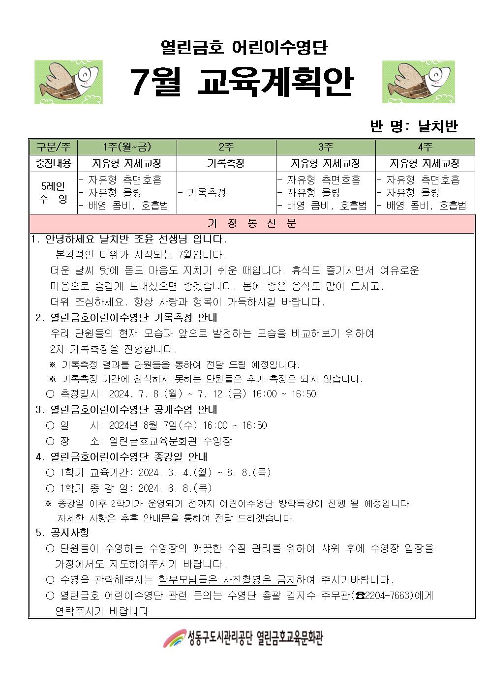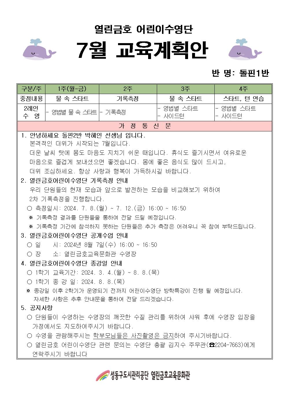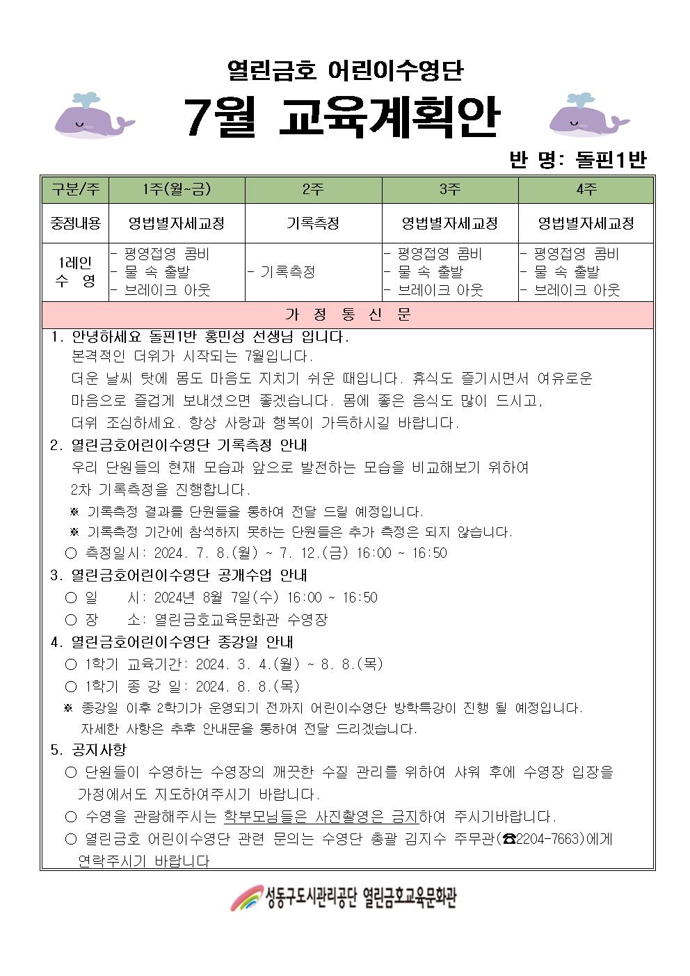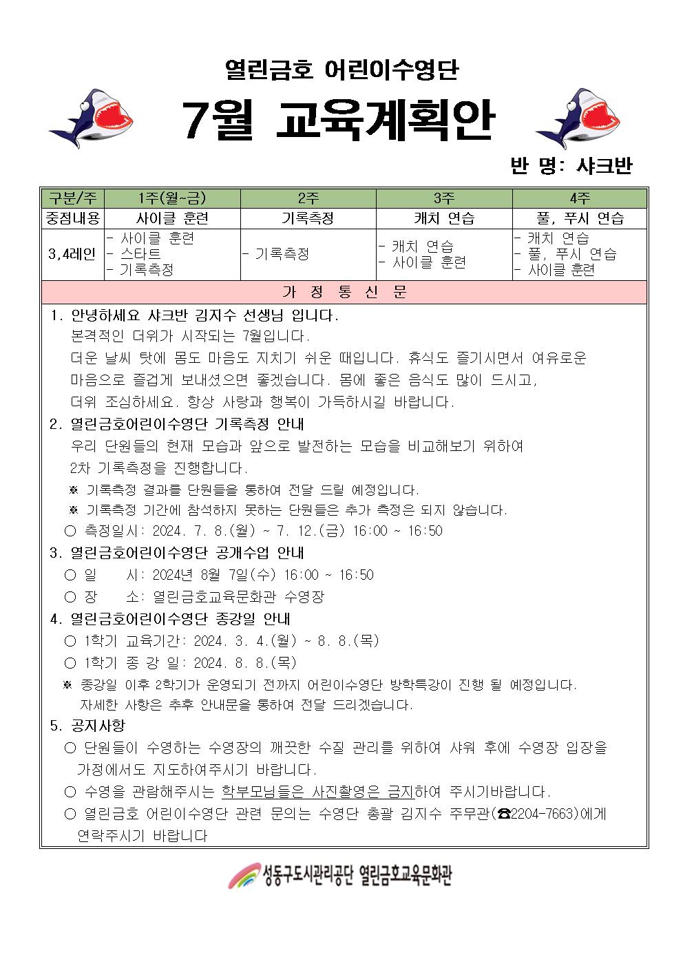 열린금호교육문화관 2024년 7월 어린이수영단 계획안(날치반, 돌핀1,2반, 샤크반) 작성자 관리자 등록일자 2024년 7월 1일 9시 31분 44초 조회 451 <열린금호 어린이수영단 7월 교육계획안> 7월 어린이수영단계획안-날치.jpg [ Size : 212.48KB , Down : 324 ] 미리보기 다운로드 7월 어린이수영단계획안-돌핀1.jpg [ Size : 204.75KB , Down : 300 ] 미리보기 다운로드 7월 어린이수영단계획안-돌핀2.jpg [ Size : 201.26KB , Down : 315 ] 미리보기 다운로드 7월 어린이수영단계획안-샤크.jpg [ Size : 205.11KB , Down : 304 ] 미리보기 다운로드 목록보기