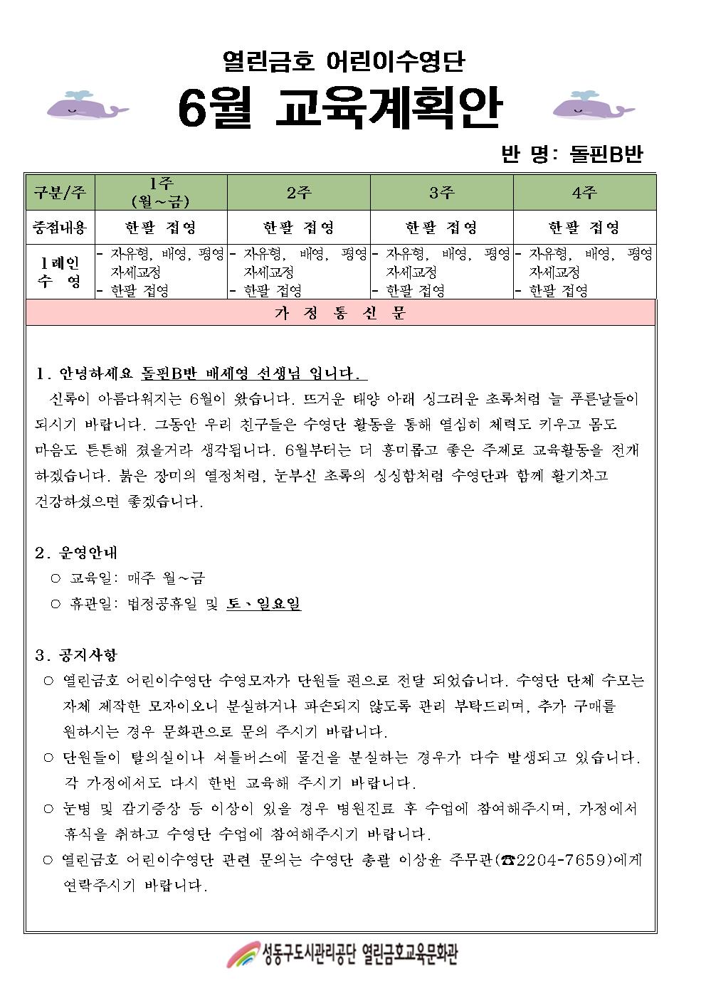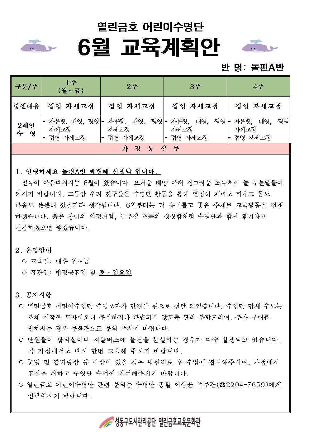 열린금호교육문화관 2023년 6월 어린이수영단 계획안(돌핀A,B반) 작성자 관리자 등록일자 2023년 5월 26일 15시 5분 56초 조회 353 어린이수영단 6월 교육계획안(돌핀A반)001.jpg [ Size : 196.6KB , Down : 442 ] 미리보기 다운로드 어린이수영단 6월 교육계획안(돌핀B반)001.jpg [ Size : 198.82KB , Down : 356 ] 미리보기 다운로드 목록보기