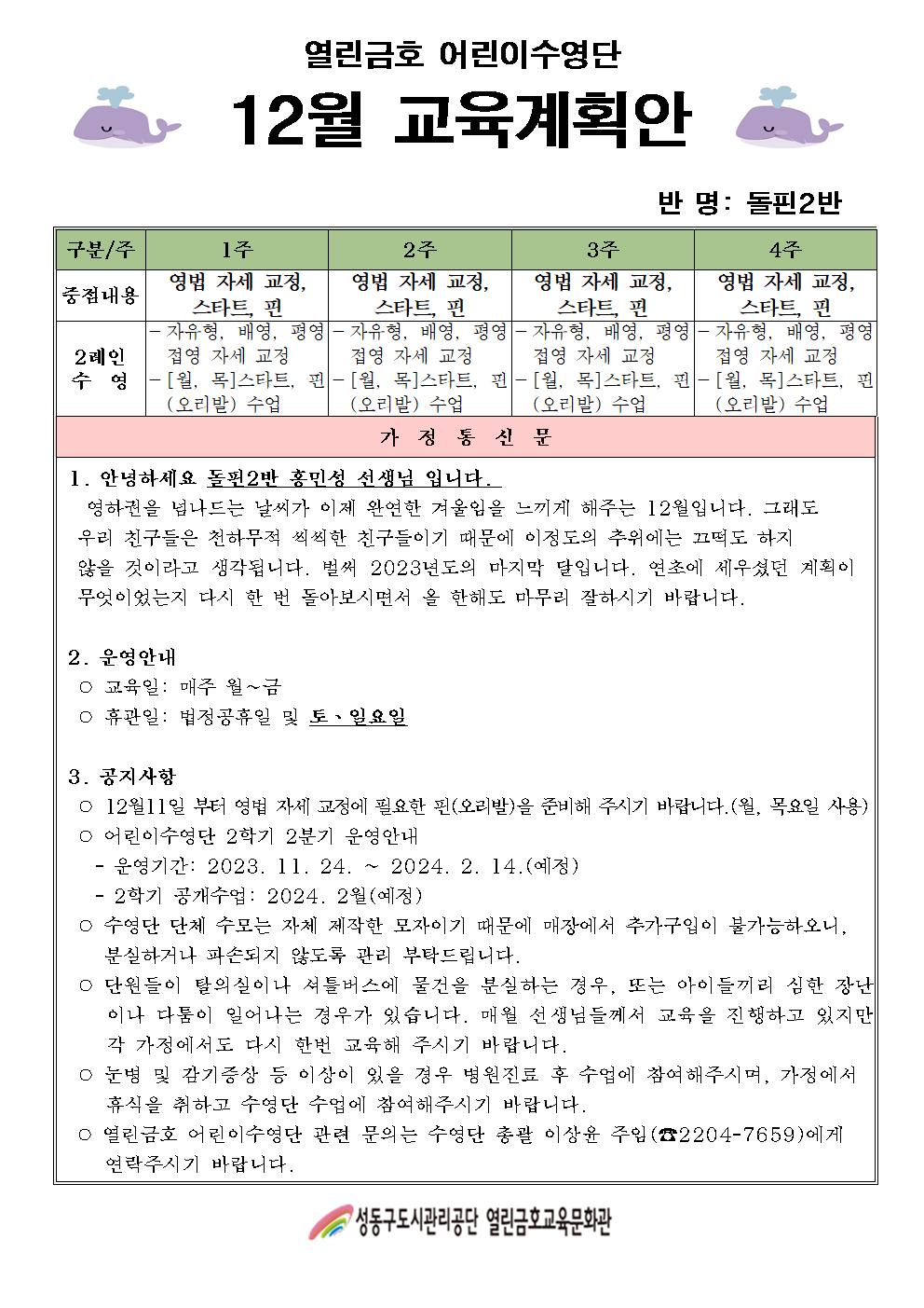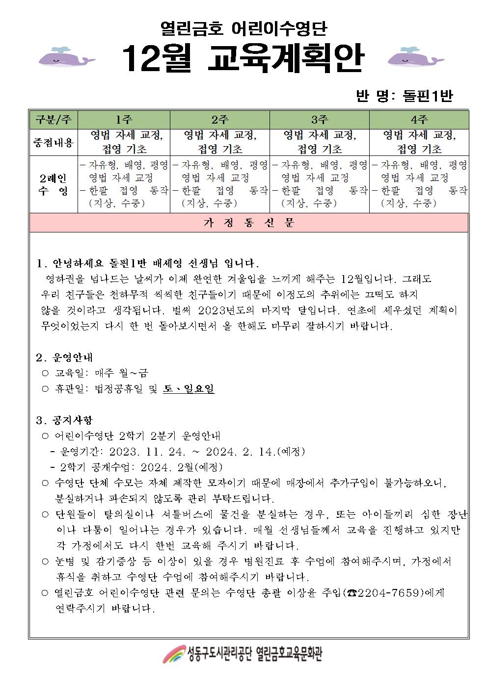 열린금호교육문화관 2023년 12월 어린이수영단 계획안(돌핀1,2반) 작성자 관리자 등록일자 2023년 11월 28일 14시 59분 4초 조회 440 안녕하세요. 열린금호 어린이 수영단 입니다.2023년 12월 어린이수영단 계획안(돌핀1,2반) 입니다. 2023년 12월 어린이수영단계획안-돌핀1반.jpg [ Size : 217.62KB , Down : 236 ] 미리보기 다운로드 2023년 12월 어린이수영단계획안-돌핀2반.jpg [ Size : 224.66KB , Down : 232 ] 미리보기 다운로드 목록보기
