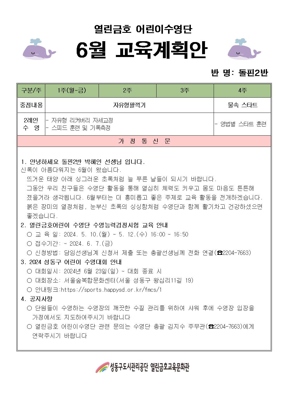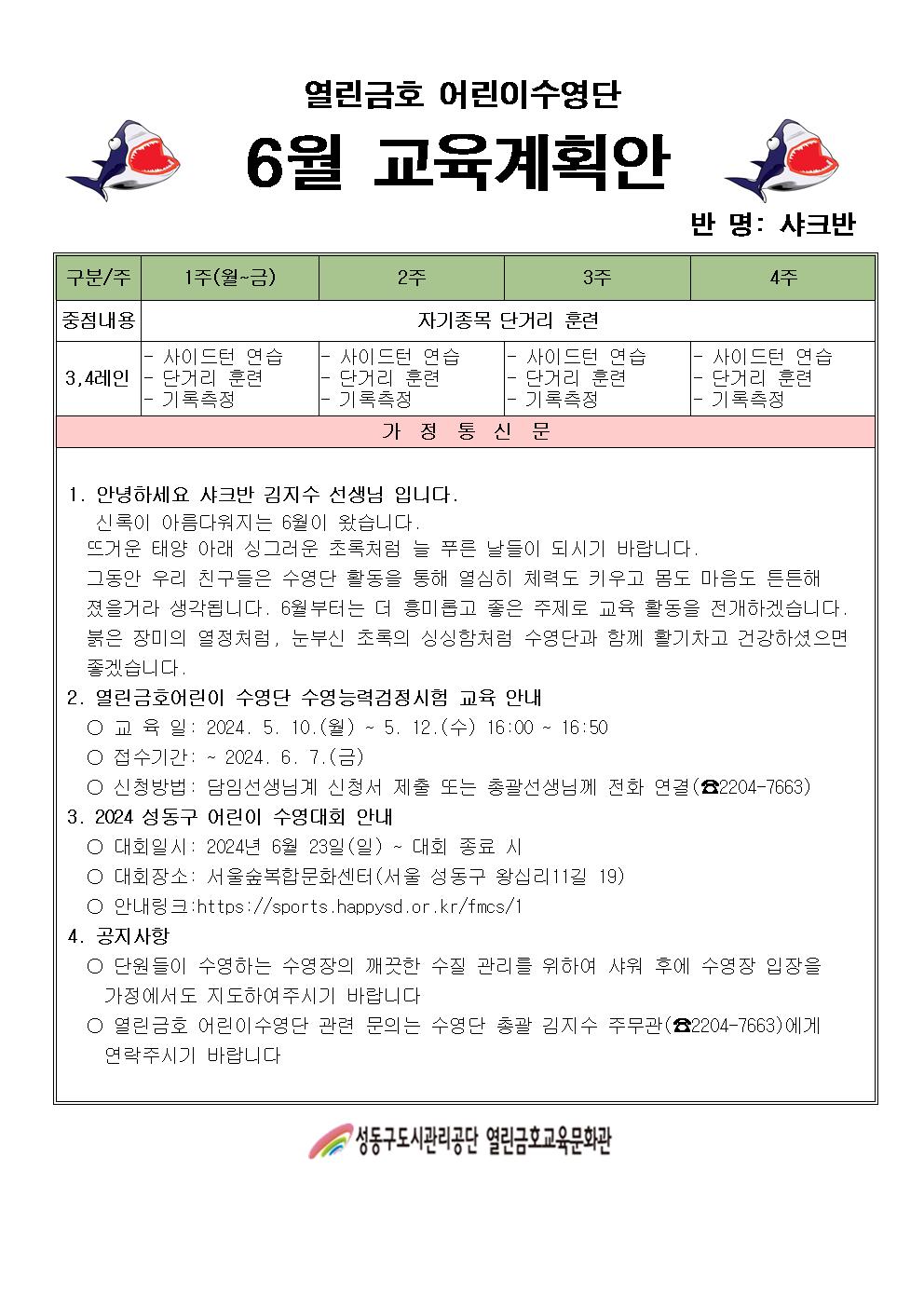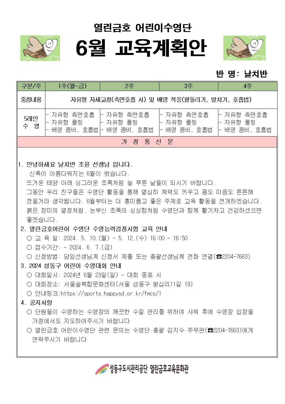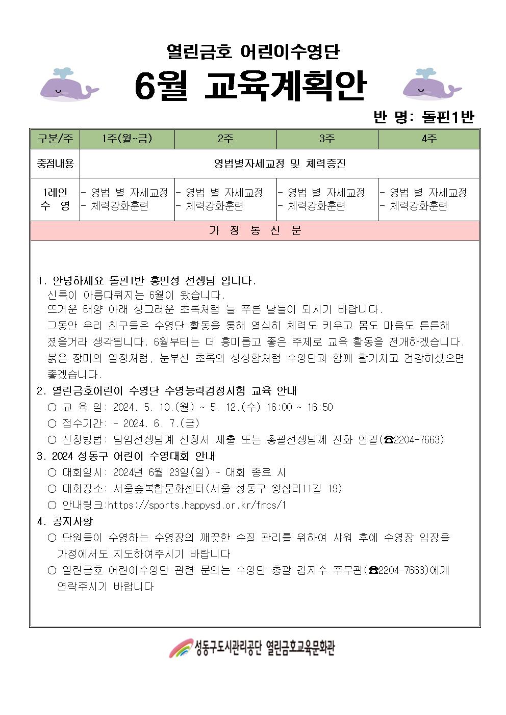 열린금호교육문화관 2024년 6월 어린이수영단 계획안(날치반, 돌핀1,2반, 샤크반) 작성자 관리자 등록일자 2024년 6월 3일 15시 28분 38초 조회 356 <열린금호 어린이수영단 6월 교육계획안> 6월 어린이수영단계획안(날치반).jpg [ Size : 203.06KB , Down : 255 ] 미리보기 다운로드 6월 어린이수영단계획안(돌핀1반).jpg [ Size : 182.87KB , Down : 245 ] 미리보기 다운로드 6월 어린이수영단계획안(돌핀2반).jpg [ Size : 177.84KB , Down : 241 ] 미리보기 다운로드 6월 어린이수영단계획안(샤크반).jpg [ Size : 191.98KB , Down : 245 ] 미리보기 다운로드 목록보기