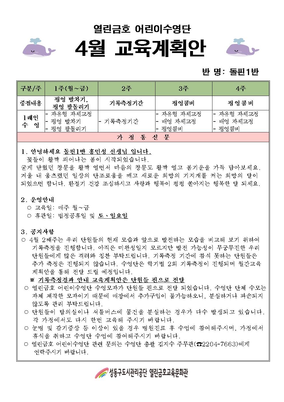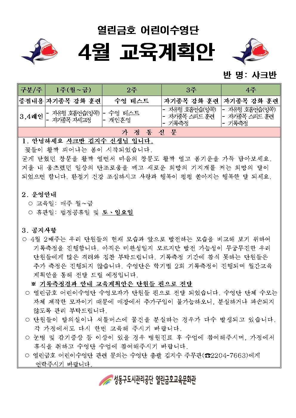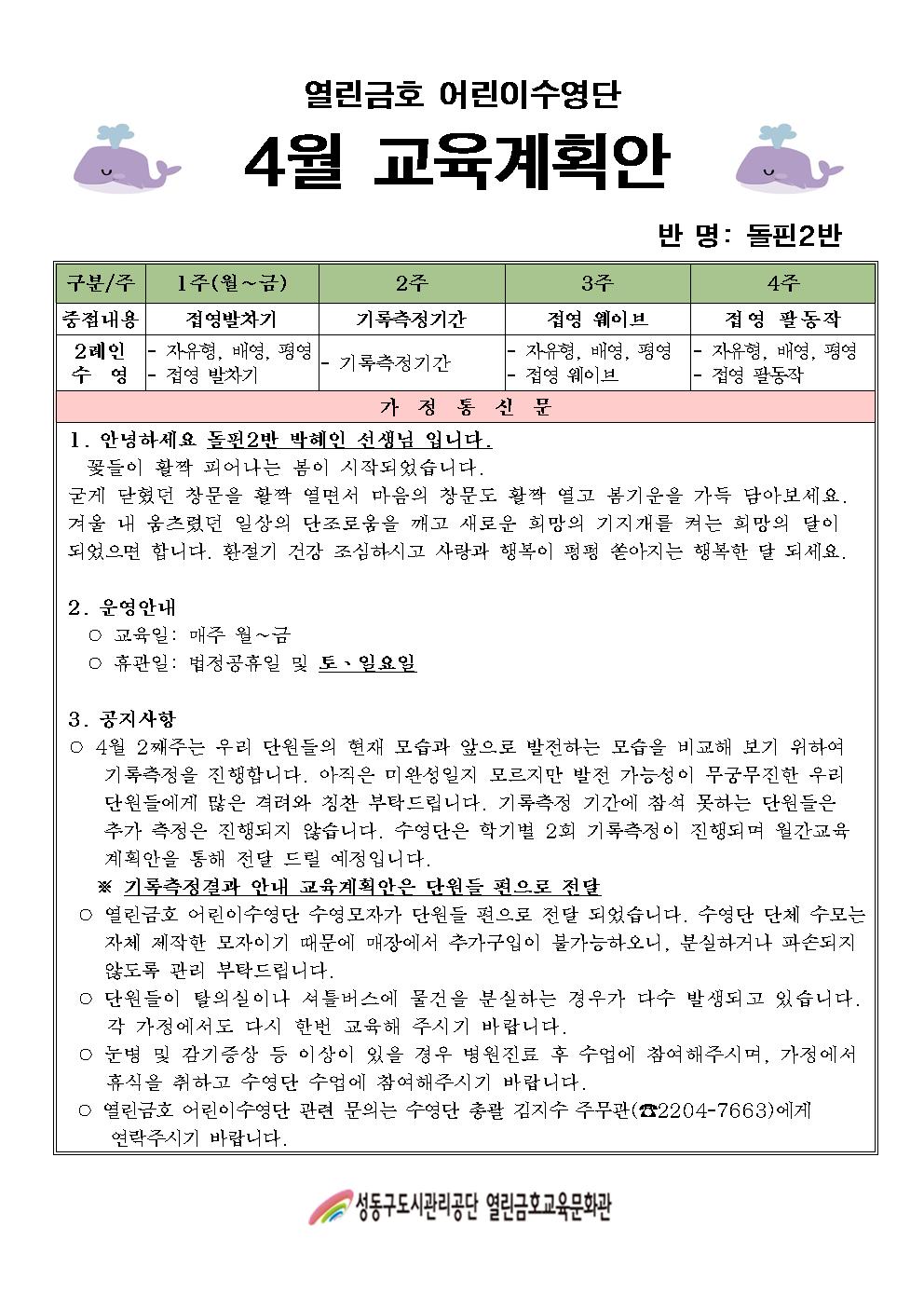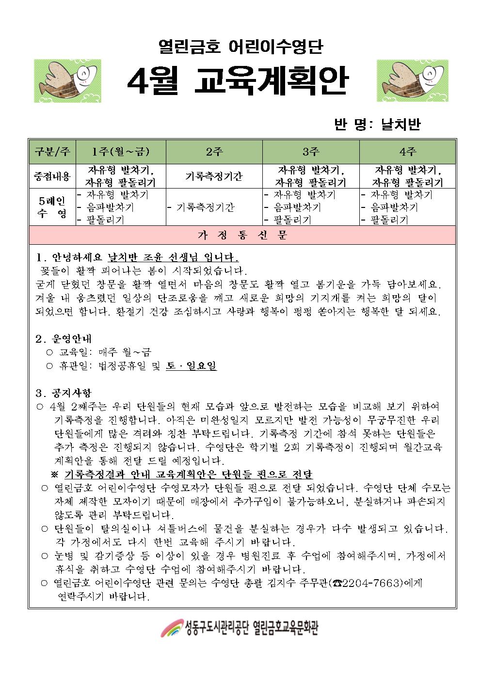 열린금호교육문화관 2024년 4월 어린이수영단 계획안(날치반, 돌핀1,2반, 샤크반) 작성자 관리자 등록일자 2024년 3월 28일 11시 15분 10초 조회 339 <열린금호 어린이수영단 4월 교육계획안> 4월 어린이수영단계획안(날치반).jpg [ Size : 236.3KB , Down : 288 ] 미리보기 다운로드 4월 어린이수영단계획안(돌핀1반).jpg [ Size : 231.25KB , Down : 288 ] 미리보기 다운로드 4월 어린이수영단계획안(돌핀2반).jpg [ Size : 226.23KB , Down : 289 ] 미리보기 다운로드 4월 어린이수영단계획안(샤크반).jpg [ Size : 235.28KB , Down : 300 ] 미리보기 다운로드 목록보기