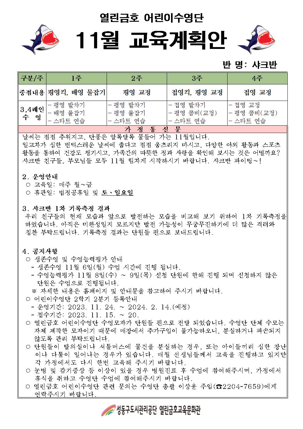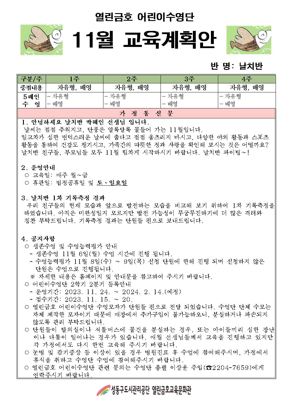 열린금호교육문화관 2023년 11월 어린이수영단 계획안(날치반,샤크반) 작성자 관리자 등록일자 2023년 10월 26일 13시 52분 28초 조회 471 안녕하세요. 열린금호 어린이 수영단 입니다.2023년 11월 어린이수영단 계획안(날치반,샤크반) 입니다. ' 2023년 11월 어린이수영단계획안001.jpg [ Size : 254.38KB , Down : 312 ] 미리보기 다운로드 2023년 11월 어린이수영단계획안004.jpg [ Size : 256.37KB , Down : 288 ] 미리보기 다운로드 목록보기