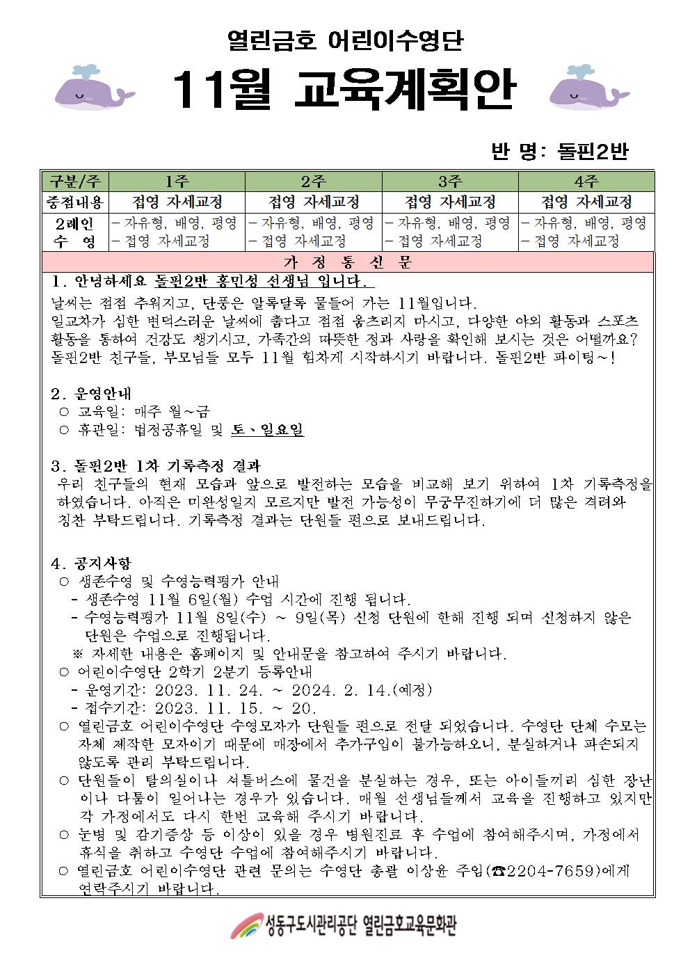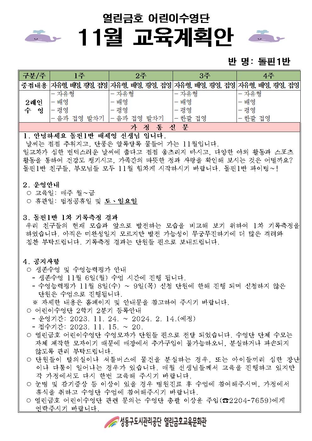 열린금호교육문화관 2023년 11월 어린이수영단 계획안(돌핀1,2반) 작성자 관리자 등록일자 2023년 10월 26일 13시 51분 46초 조회 441 안녕하세요. 열린금호 어린이 수영단 입니다.2023년 11월 어린이수영단 계획안(돌핀1,2반) 입니다.' 2023년 11월 어린이수영단계획안002.jpg [ Size : 261.34KB , Down : 270 ] 미리보기 다운로드 2023년 11월 어린이수영단계획안003.jpg [ Size : 258.5KB , Down : 252 ] 미리보기 다운로드 목록보기