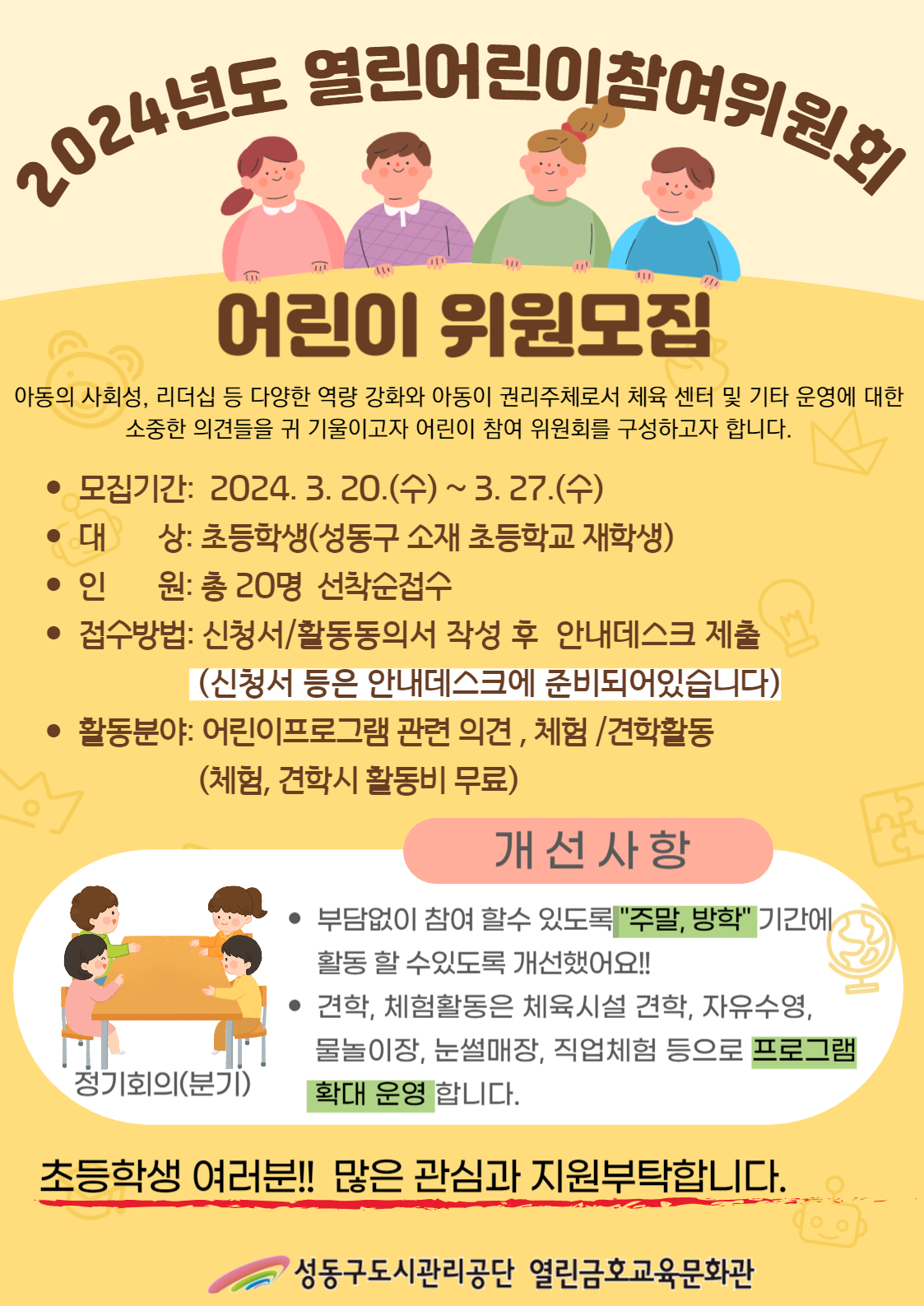 열린금호교육문화관 열린금호교육문화관 열린어린이참여위원회 모집 작성자 관리자 등록일자 2024년 3월 20일 10시 55분 42초 조회 333 2024년도 열린어린이참여위원회.png [ Size : 521.77KB , Down : 237 ] 미리보기 다운로드 지원신청서 및 활동동의서(2024년도).pdf [ Size : 90.86KB , Down : 423 ] 다운로드 목록보기