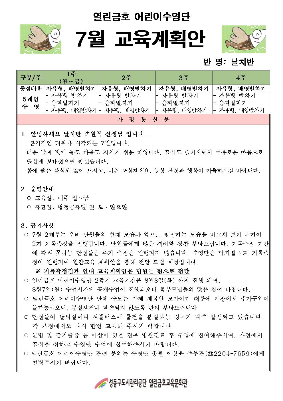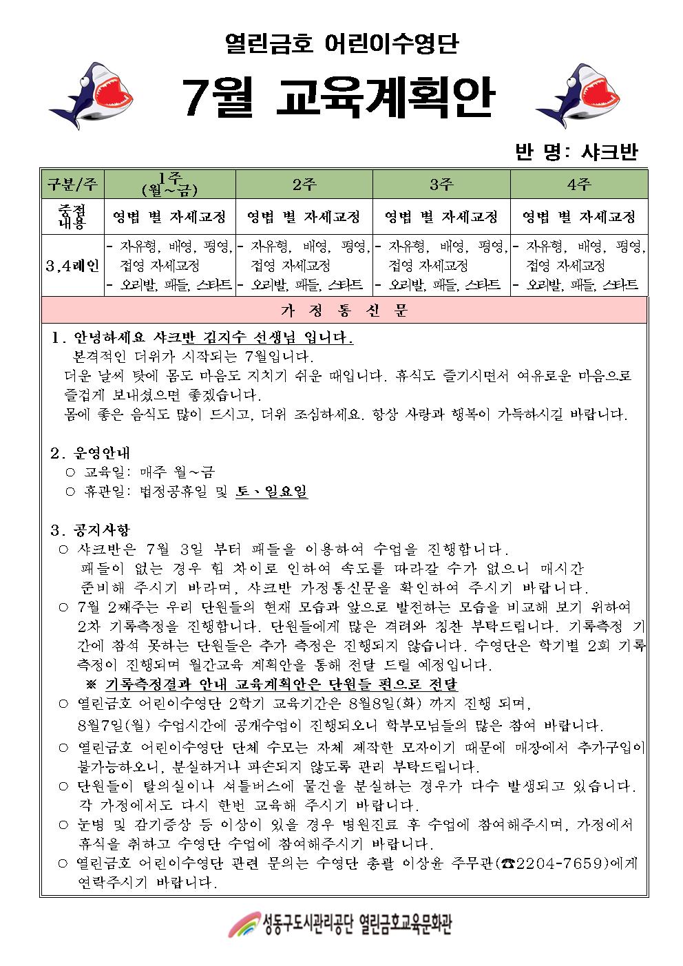 열린금호교육문화관 2023년 7월 어린이수영단 계획안(날치반,샤크반) 작성자 관리자 등록일자 2023년 6월 26일 14시 26분 29초 조회 354 2023년 7월 어린이수영단계획안(날치반).jpg [ Size : 240.63KB , Down : 326 ] 미리보기 다운로드 2023년 7월 어린이수영단계획안(샤크반).jpg [ Size : 252.82KB , Down : 311 ] 미리보기 다운로드 목록보기