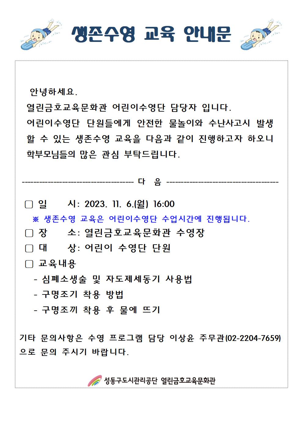 열린금호교육문화관 생존수영 교육 안내문 작성자 관리자 등록일자 2023년 10월 23일 15시 12분 4초 조회 417 생존수영 교육 안내문(어린이수영단).jpg [ Size : 142.36KB , Down : 390 ] 미리보기 다운로드 목록보기